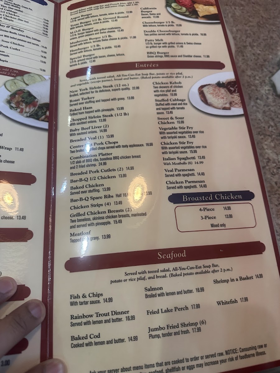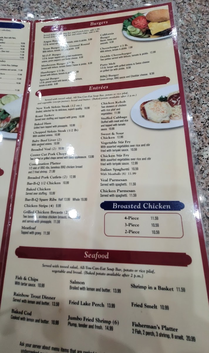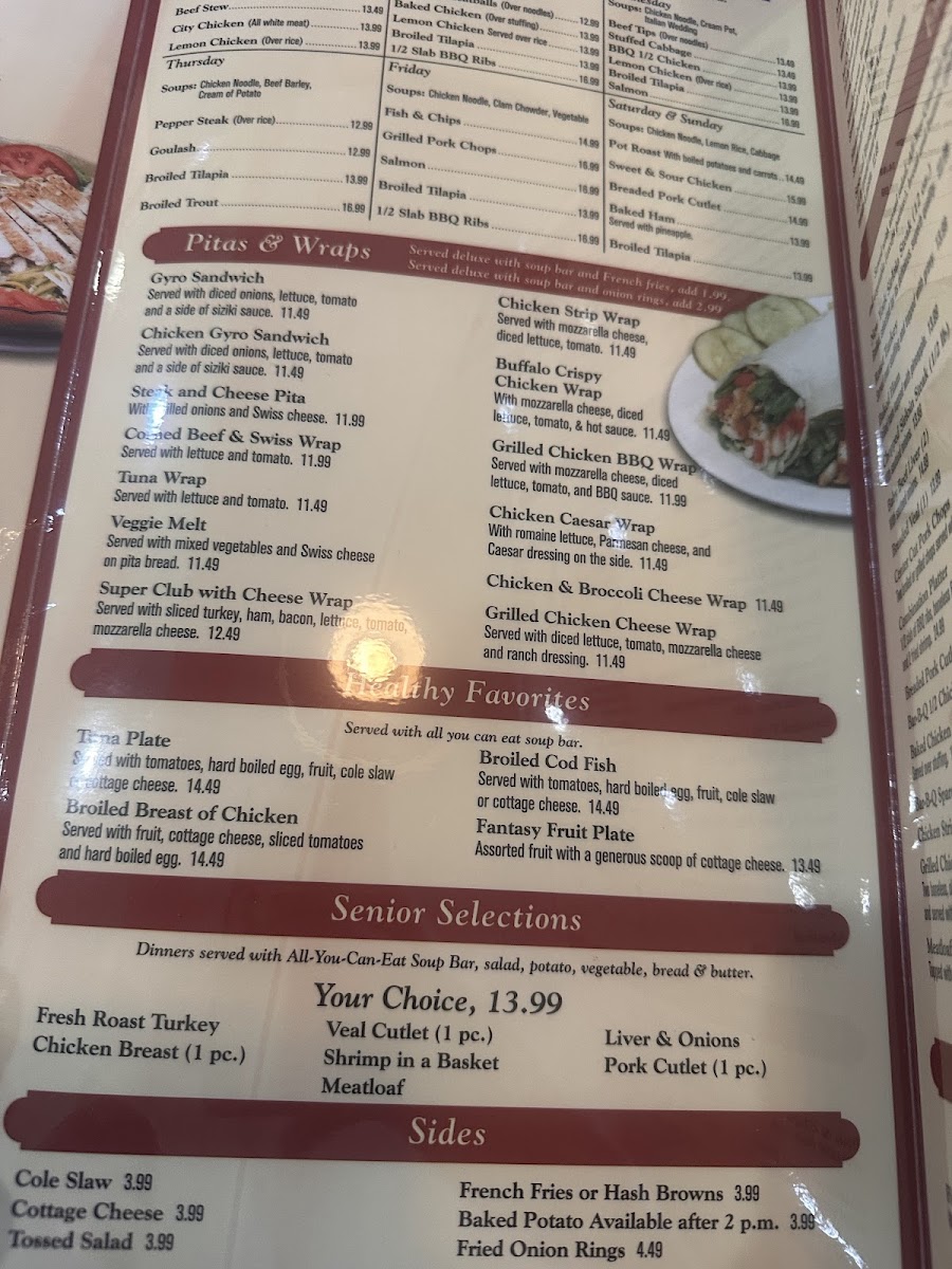 For lunch and dinner, the menu features a range of satisfying dishes from grilled chicken salad and meatloaf to comforting soups such as hearty chicken noodle and cabbage soup. Dinner specials like veal parmesan, beef tips, and mixed broasted chicken bring a home-cooked feel to the table, complemented by simple sides like coleslaw and ranch-dressed salads.